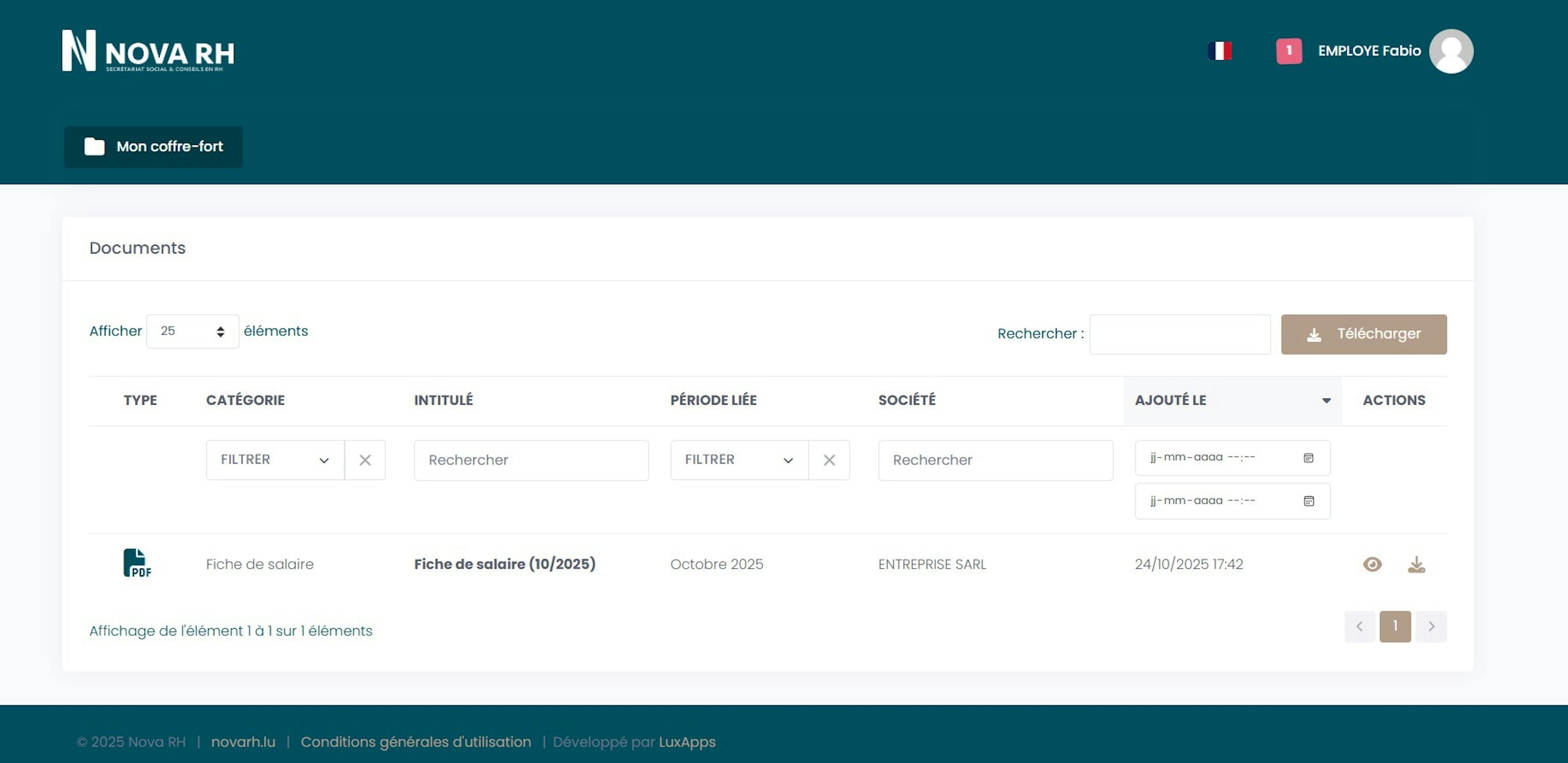 Conçue comme un véritable coffre-fort numérique, elle vous permet d’accéder à tout moment à vos fiches de paie, certificats, archives mensuelles et documents RH, sans dépendre des e-mails ni de fichiers dispersés.